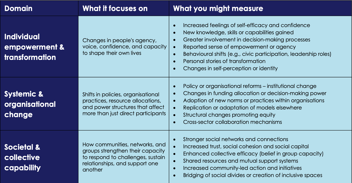 This framework isn’t meant to be prescriptive. Not every measure will be relevant to your work, and there may be important indicators we haven’t captured. Work with your stakeholders to define what outcomes look like in your unique context. What does empowerment mean for the participants you’re working with? What does systems change look like in your organisation?